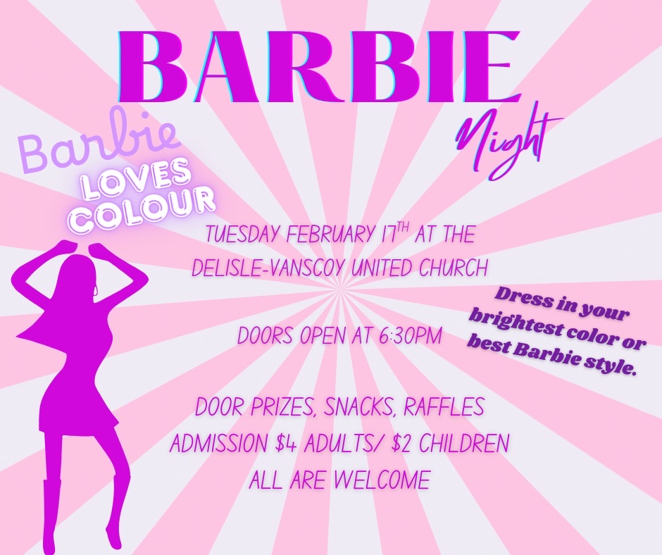 Delisle Vanscoy United Church invites you to our annual Barbie Night! Join us for games, treats, prizes, and an opportunity to shop for outfits for all of your Barbies. This beloved event has been running in the community for over 20 years!