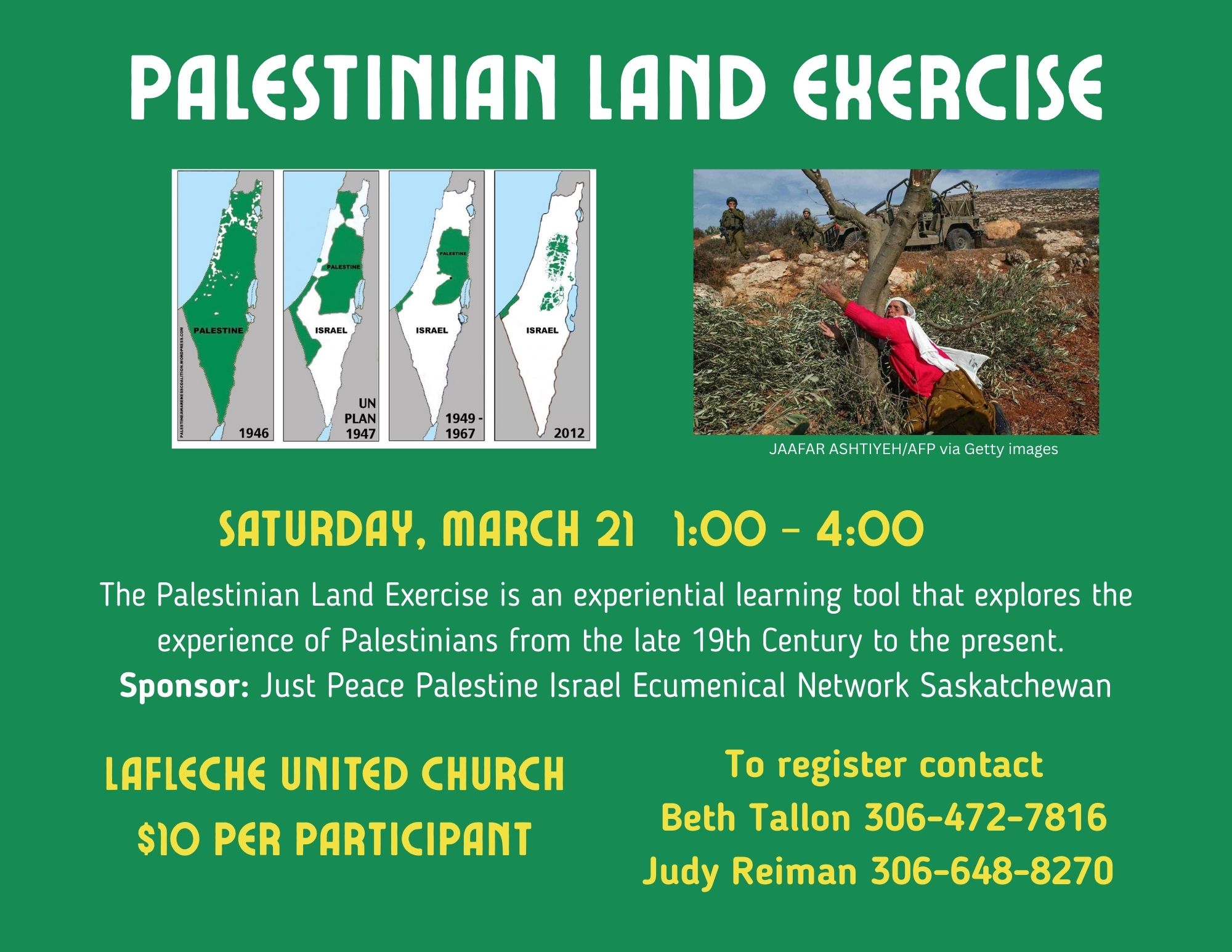 Lafleche is hosting the Palestine Land Exercise on Saturday, March 21st from 1-4 PM. The Palestine Land Exercise is an experiential learning activity of 2 and a half hours overall with a snack break included. It’s designed for 25 to 30 participants that sit around a large fabric map and unveil the story of Palestine starting from the time the British were there to the present time. The story progresses through cards that participants read aloud. At the end of the exercise, there will be a talking circle where it will be possible to ask questions and express one’s impressions of the activity. The final topic is “What do we do next?” and a power point will be shown to conclude the exercise. To reserve your spot, please call Judy Reiman (306-648-8270) or Beth Tallon (306-472-7816). Cost is $10/participant to cover the cost of mileage for our presenters.