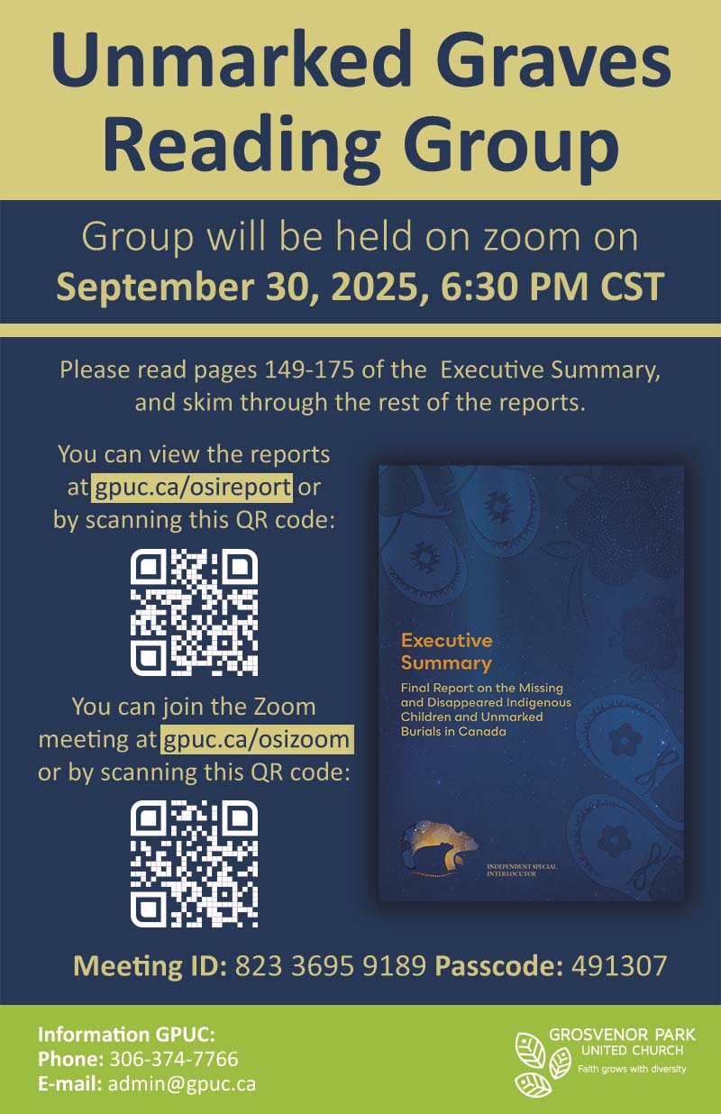 Our next Zoom meeting for the Unmarked graves Reading Group will be on Tuesday Sept 30 at 6:30 pm CST (Saskatchewan). We’re focusing this time on pages 149-175 of the executive summary - please read before the meeting. We will begin with a time of reading short excerpts which have touched us, with silence before […]