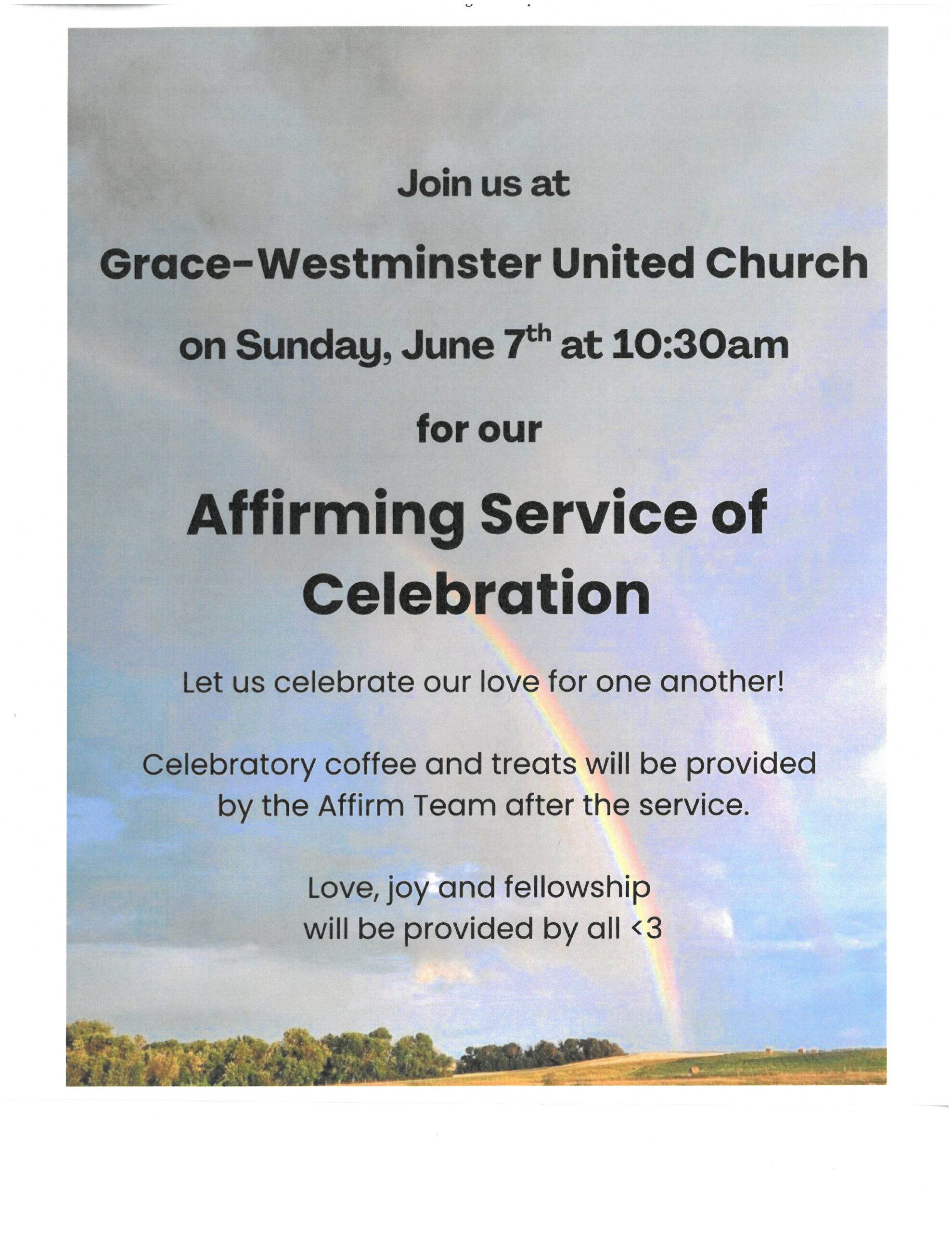 Affirming Service of Celebration Sunday, June 7th at 10:30 am